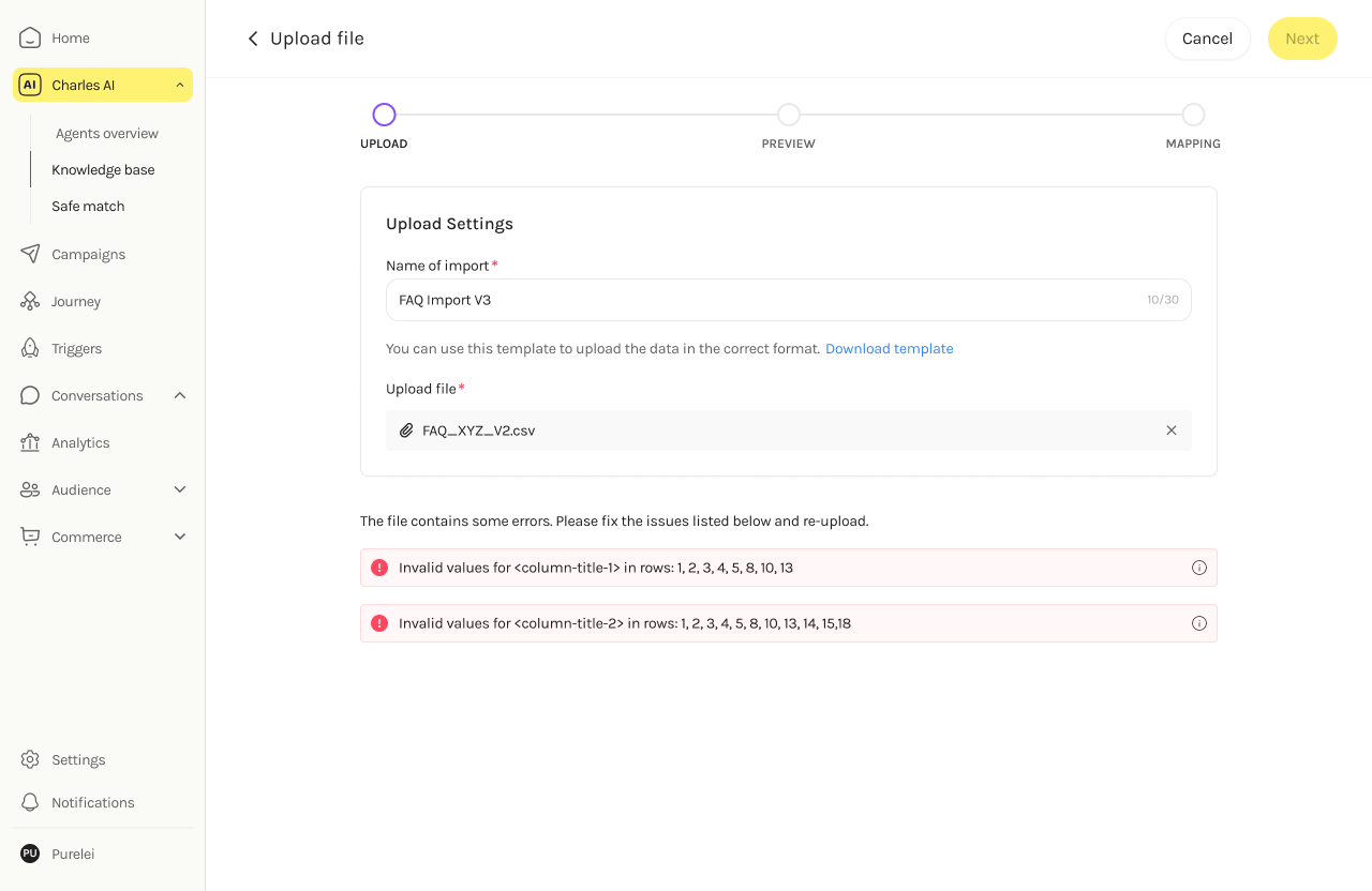After uploading, we immediately scan for special characters or formatting issues. If found, users are prompted to fix and re-upload before moving forward.