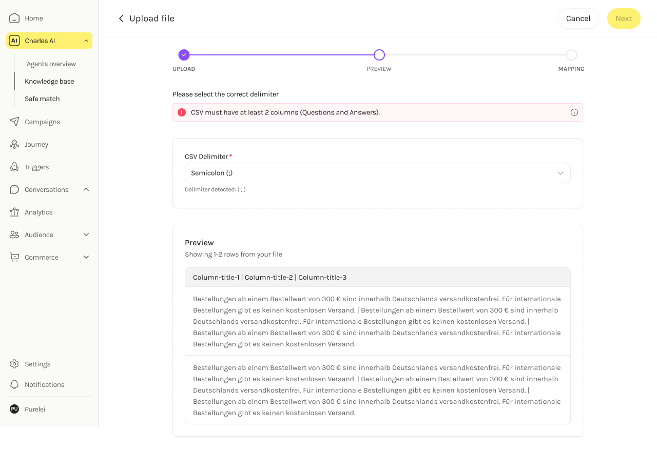 We use PapaParse to auto-detect the file's delimiter and show a preview. If fewer than two columns are detected, an error prompts the user to manually select the correct delimiter.