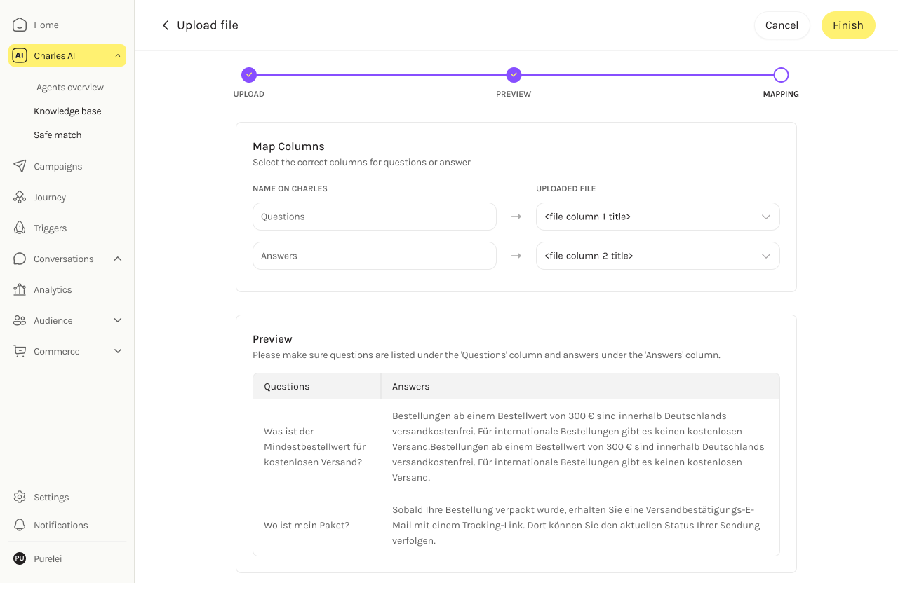 For files with more than two columns, users map which ones correspond to the question and answer fields.