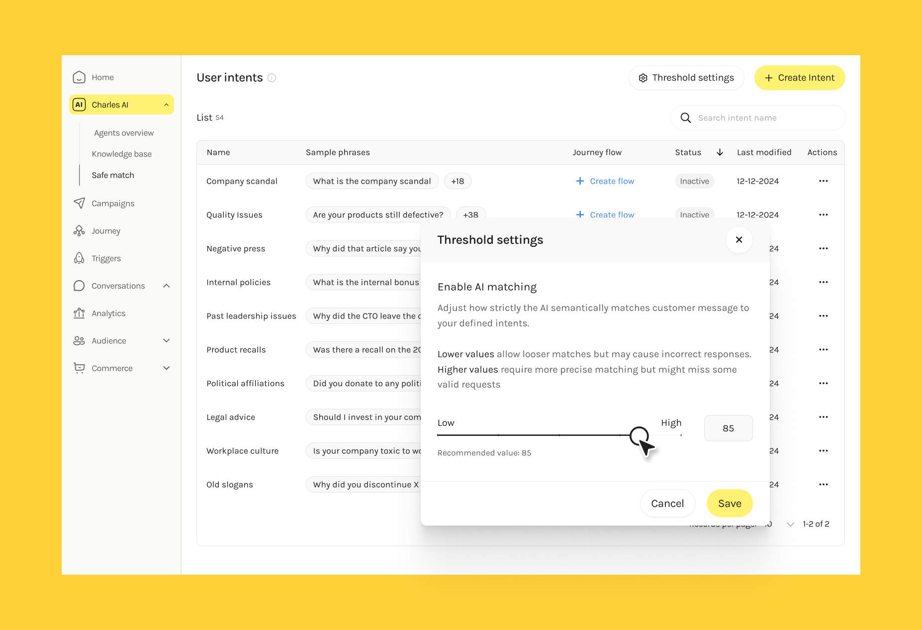 To solve this, we introduced SafeMatch, a feature that lets businesses flag sensitive keywords. When matched, the AI triggers a fallback flow (using our already existing flowbuilder) instead of replying freely, helping brands stay in control of sensitive conversations.