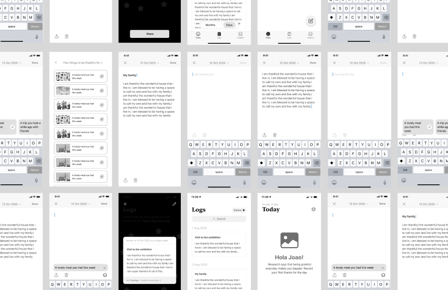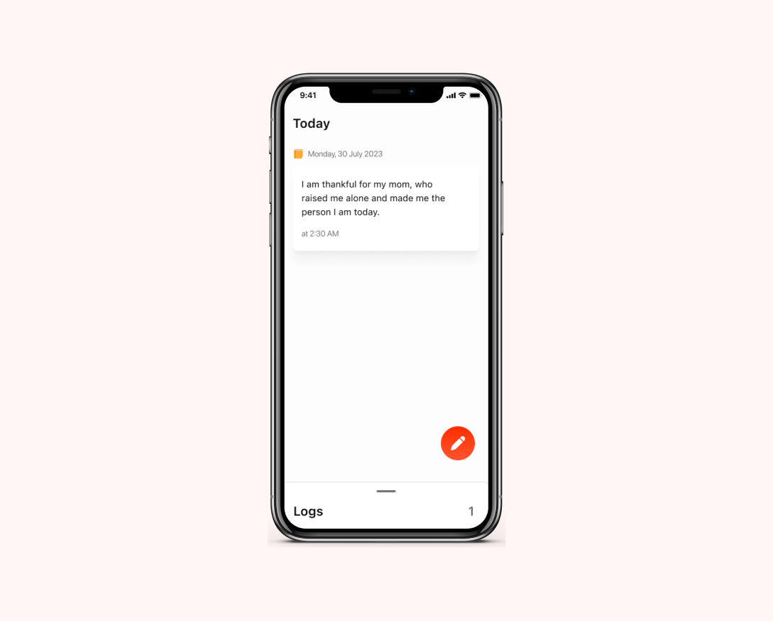 In shaping the app's initial user experience, we went for a minimalist onboarding. With a concise message and an obvious 'start writing' button, we aimed to reduce cognitive load and make it effortless for users to begin their gratitude journey. After jotting down their thoughts, a 'done' button simplifies the process of saving the log."
